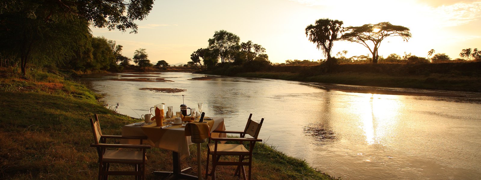 At Larsen’s we do not let anything get in the way. Watch elephants wade in the river and giraffes meander along the opposite bank while you dine alfresco. The evening’s candlelight dinners, serenaded by the gentle sounds of the Kenyan night, are the perfect way to end the day. Gourmet four-course meals are served for breakfast, and dinner, and our buffet breakfast will ensure that you are all set for a day on safari. Enjoy the perfect end to an evening game drive with one of the most iconic Safari experiences, the sundowner. Relax and enjoy the sunset with a drink in your hand.