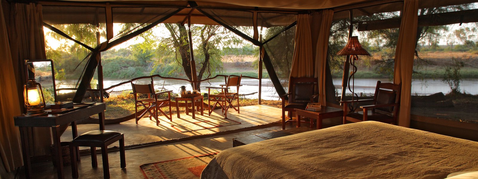 Each exclusive tent is secluded and private, the perfect place to be lulled to sleep by the sound of the Ewaso Nyiro river during the Kenyan night. Facing the river and shaded by palm trees you can watch the sun rise from the porch of your tent. Each tent has a spacious king bed, porch and an ensuite bathroom. Authentic furniture and decorations take you back to the experiences of the early pioneers.